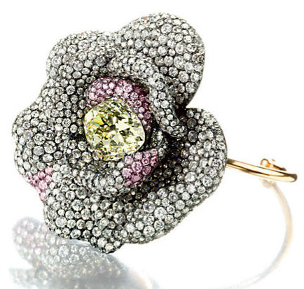 2012/05/18 Christie’s Geneva Lily Safra Collection 5 “JAR” イエローダイヤモンド:13.03cts 真中にオールドカットのイエローダイヤモンドをセットし、周りにメレーダイヤモンドをパヴェセッティング(彫り留め)したCamellia(椿)を模したバングルです。…more